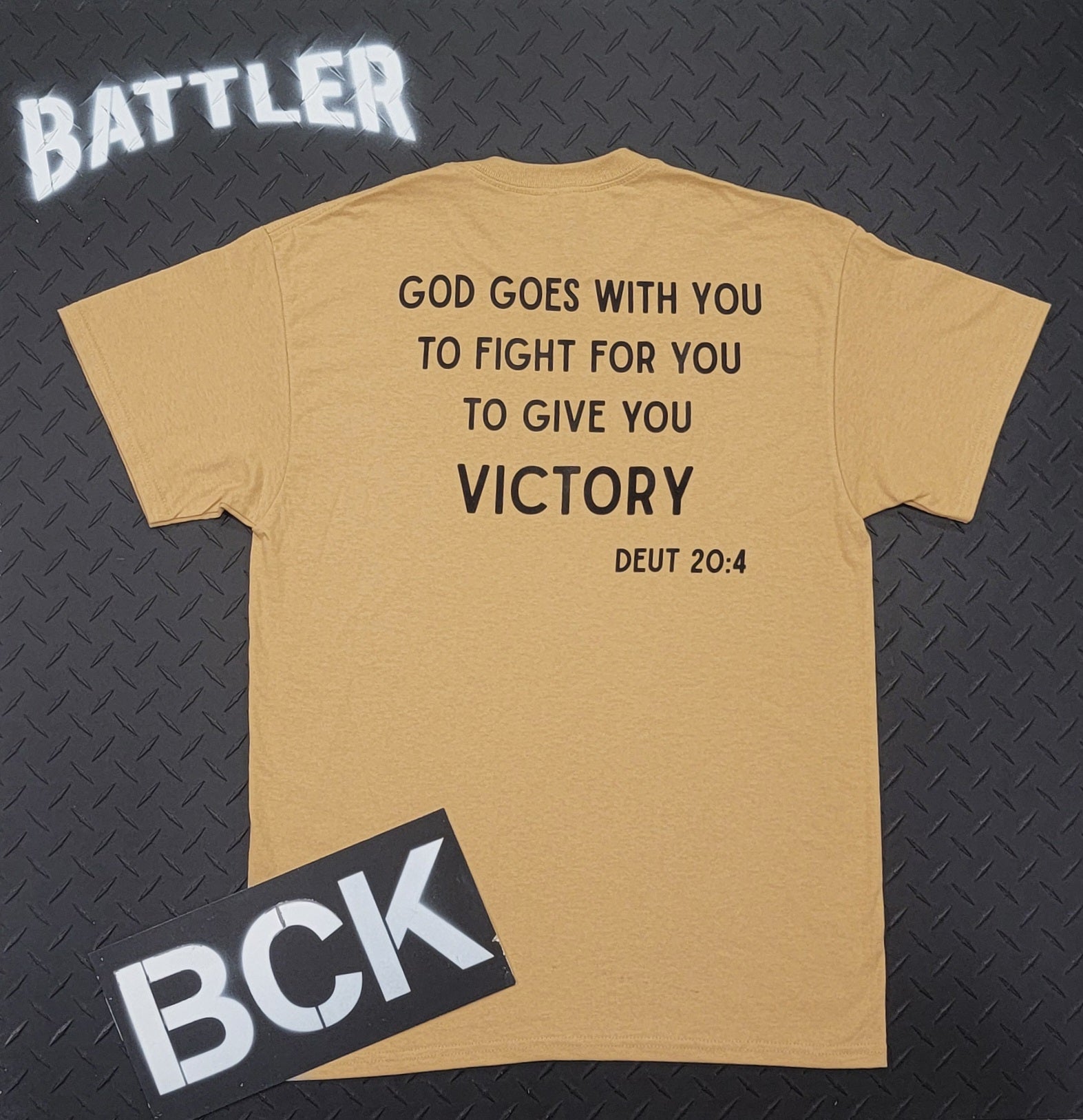 Double-Sided Redemption Day / Deut 20:4 Tee (Black on Old Gold)